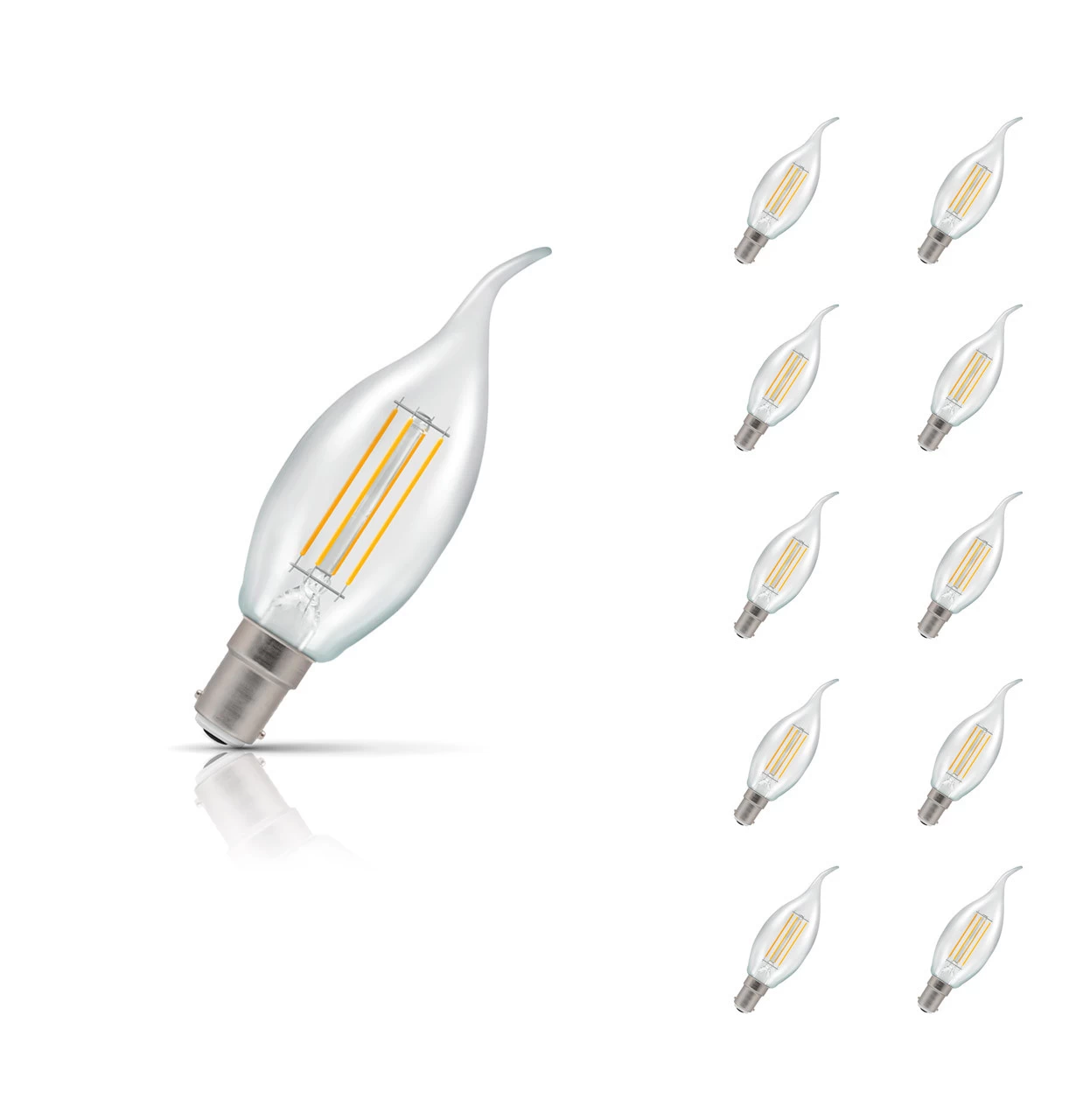 A value pack of 10 Crompton LED filament candle light bulbs which give a unique effect of real flame thanks to their bent tips.