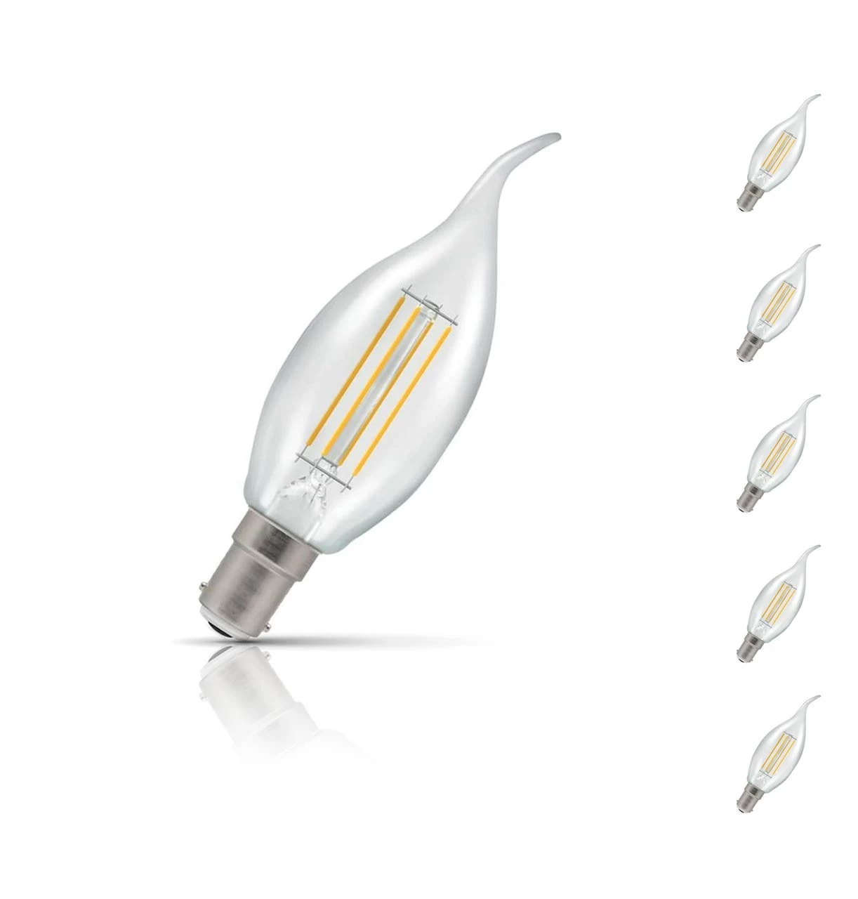 A value pack of 5 Crompton LED filament candle light bulbs which give a unique effect of real flame thanks to their bent tips.