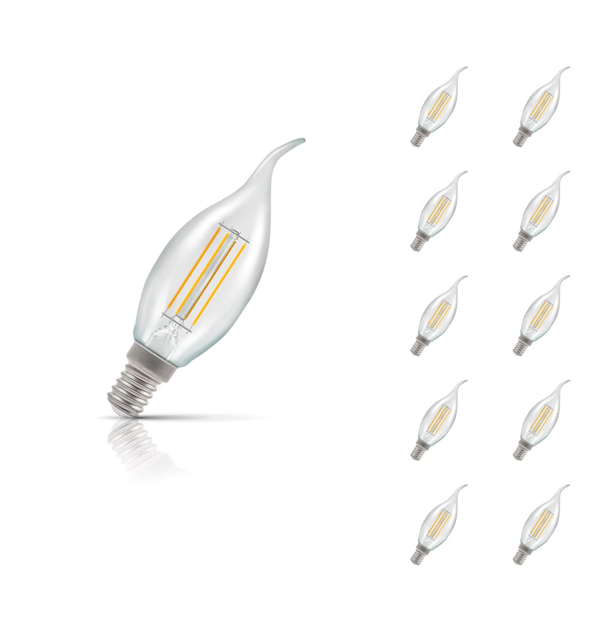A value pack of 10 Crompton LED filament candle light bulbs which give a unique effect of real flame thanks to their bent tips.
