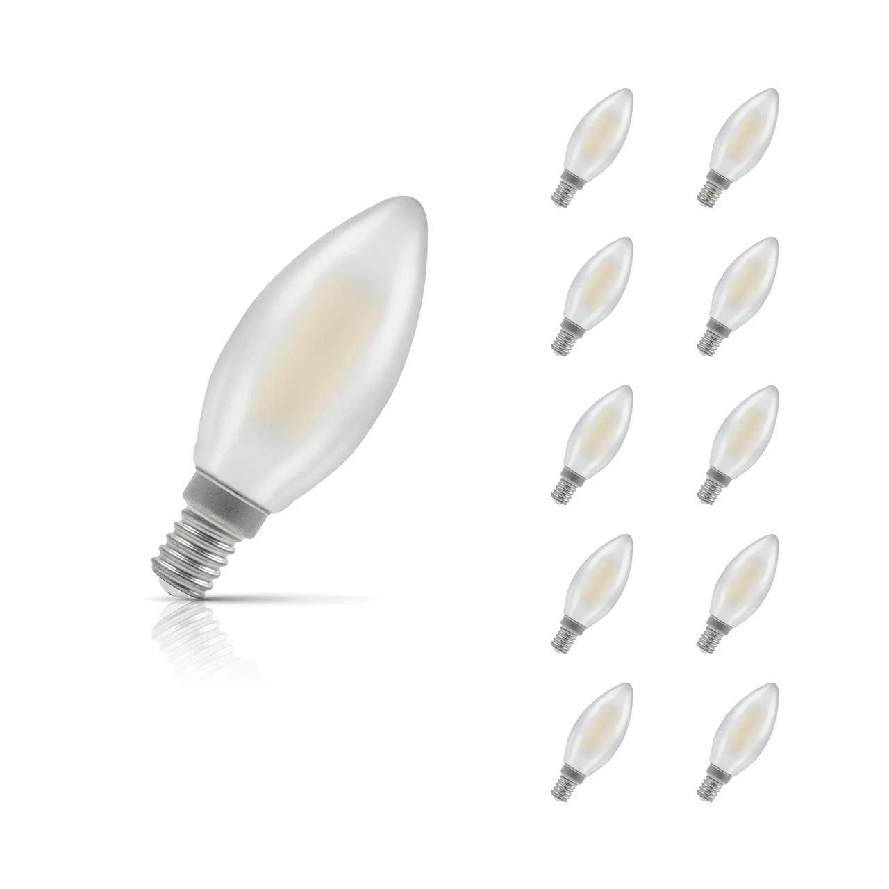 This bulk-buy value pack of 10x Crompton Lamps 4.2W LED candle light bulbs with SES-E14 small Edison screw (14mm) fittings are direct replacements for traditional 40W light bulbs, but have the potential to reduce your home lighting bills and reduce the frequency of needing to replace your light bulbs.