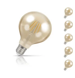 A value pack of 5 fully dimmable 5W LED G95 globe light bulb is part of a wider range that has been developed by Crompton Lamps as a means of replacing its outgoing antique filament range.