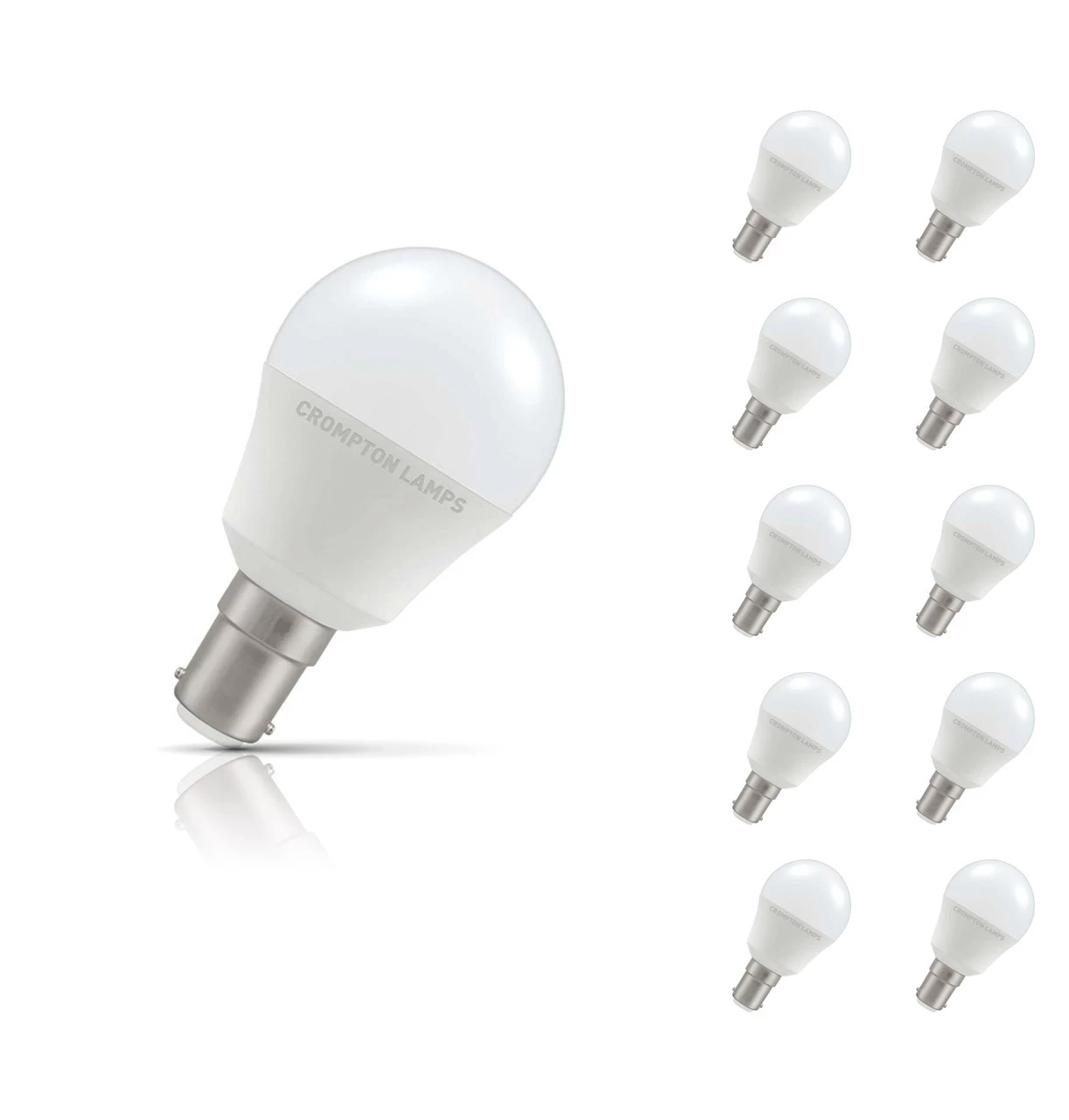 This bulk-buy value pack of 10x Crompton Lamps 5.5W LED golfball light bulbs with SBC-B15d small bayonet (15mm) caps are retrofit replacements for incandescent 40W light bulbs, but have the potential to reduce your home lighting bills and reduce the frequency of needing to replace your light bulbs.