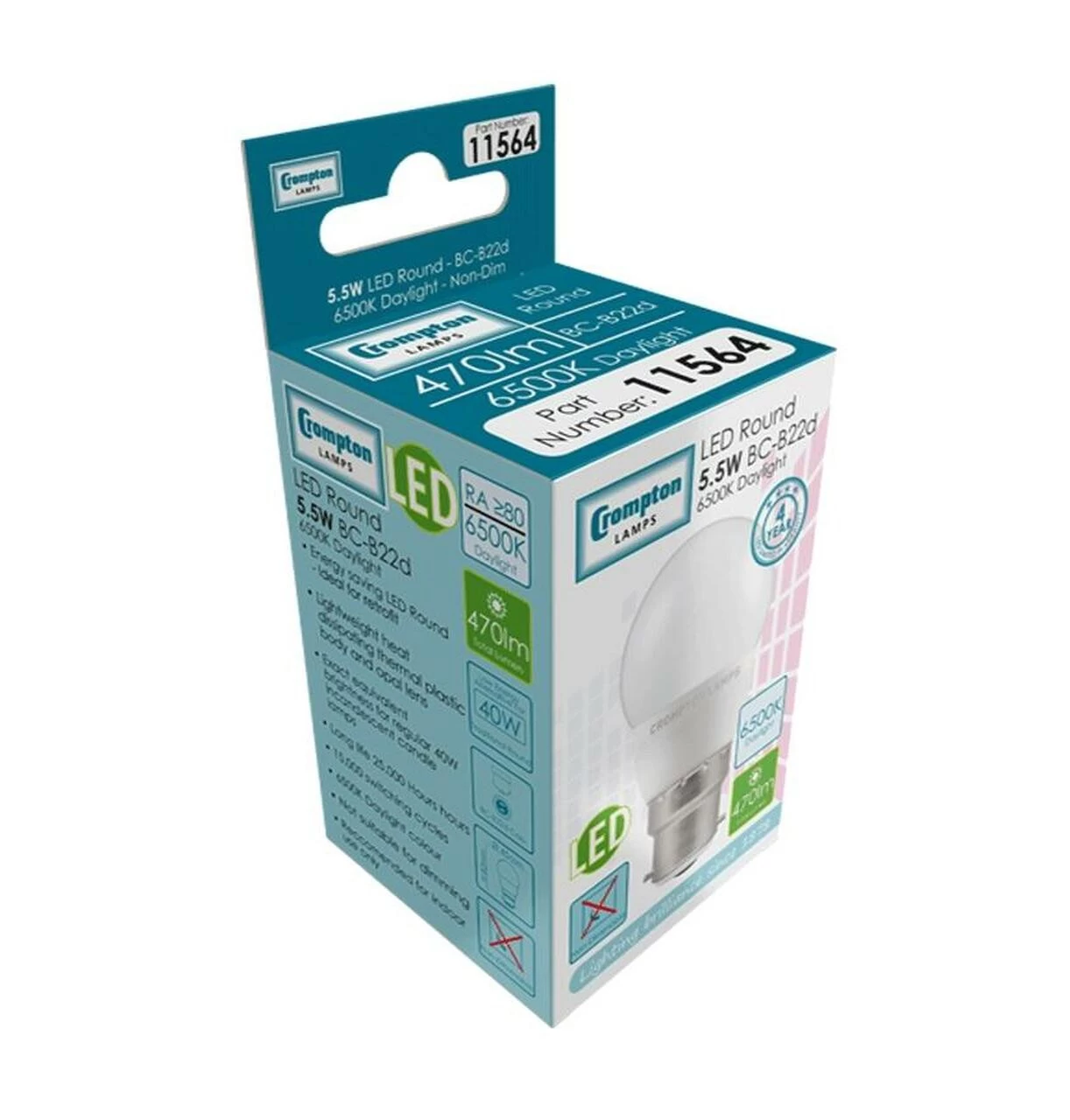 This Crompton Lamps 5.5W LED golfball light bulb with a BC-B22d bayonet (22mm) cap is a retrofit replacement for a incandescent 40W light bulb, but has the potential to reduce your home lighting bills and reduce the frequency of needing to replace your light bulbs.
