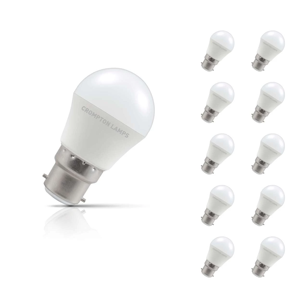 This bulk-buy value pack of 10x Crompton Lamps 5W fully dimmable LED golfball light bulbs with BC-B22d bayonet (22mm) caps are retrofit replacements for incandescent 40W light bulbs, but have the potential to reduce your home lighting bills and reduce the frequency of needing to replace your light bulbs.