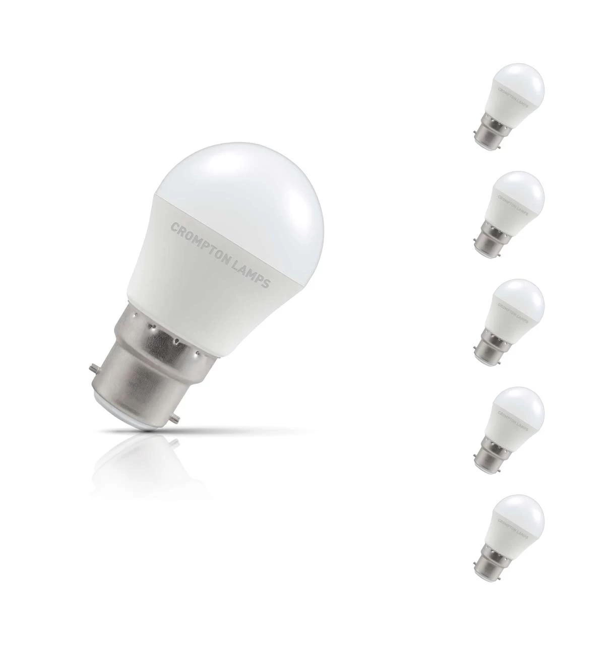 This bulk-buy value pack of 5x Crompton Lamps 5W fully dimmable LED golfball light bulbs with BC-B22d bayonet (22mm) caps are retrofit replacements for incandescent 40W light bulbs, but have the potential to reduce your home lighting bills and reduce the frequency of needing to replace your light bulbs.