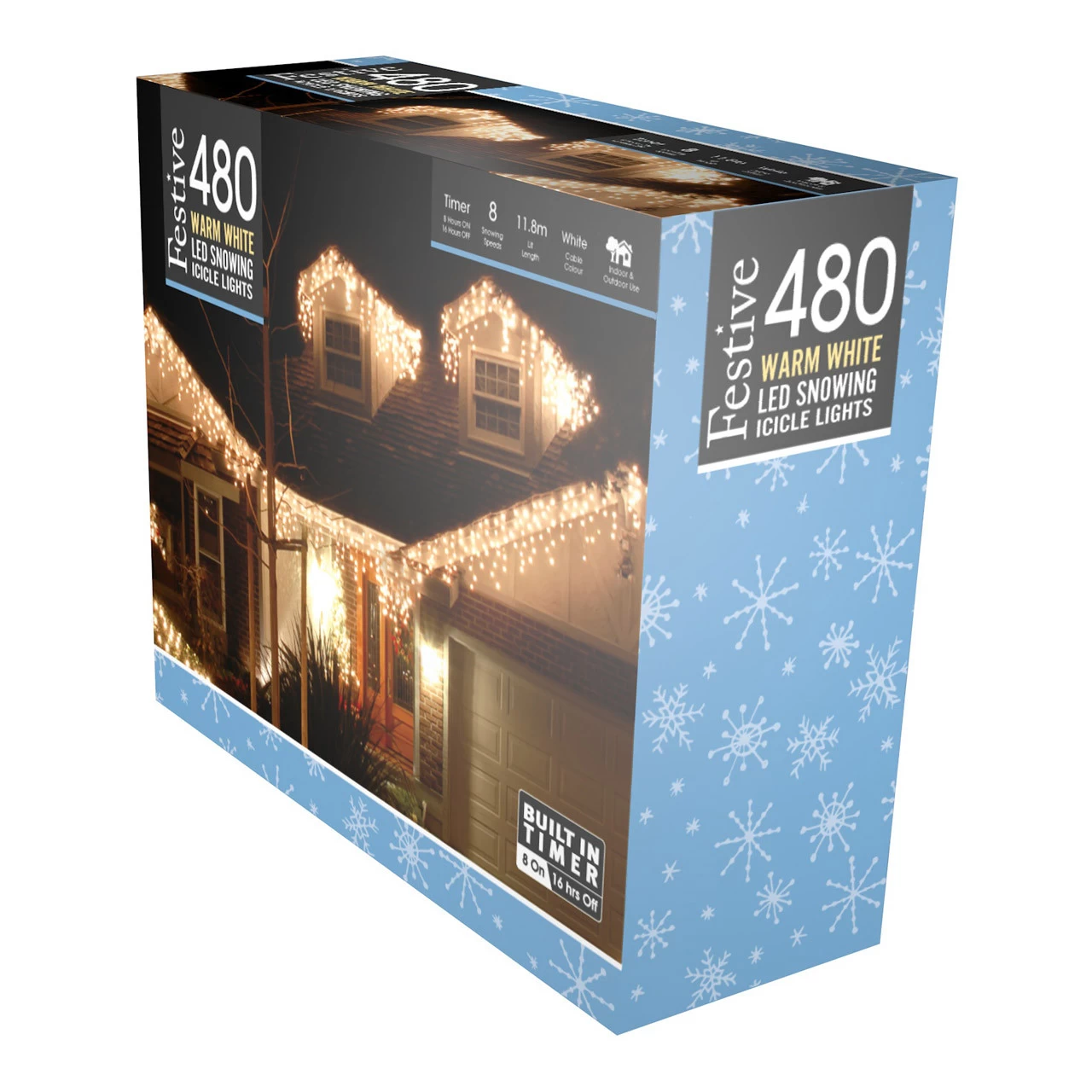 Festive 11.8m Indoor & Outdoor Snowing Effect Icicle Christmas Lights 480 Warm White LEDs