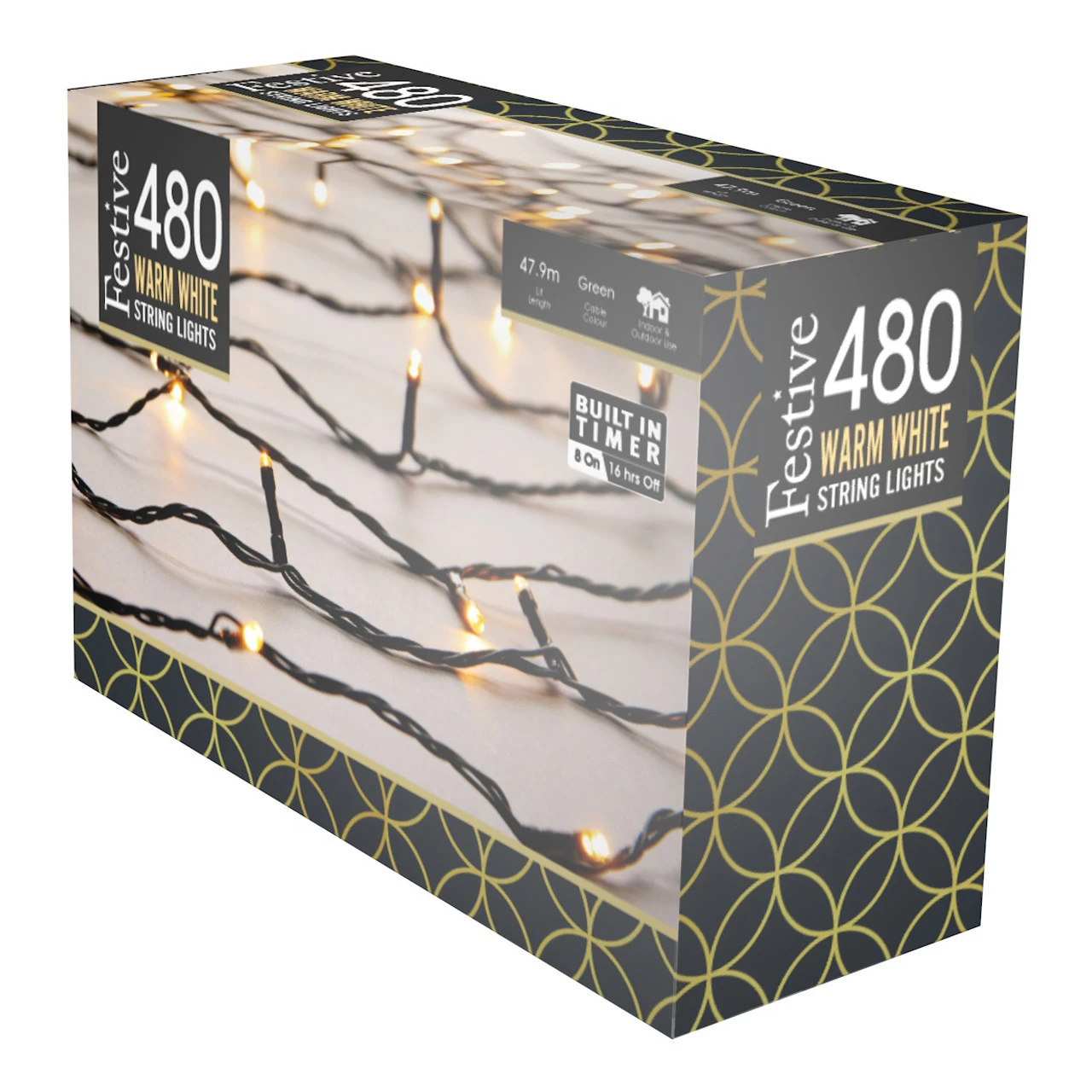Festive 38.3m Indoor & Outdoor Multifunction Christmas Fairy Lights 480 Warm White LEDs