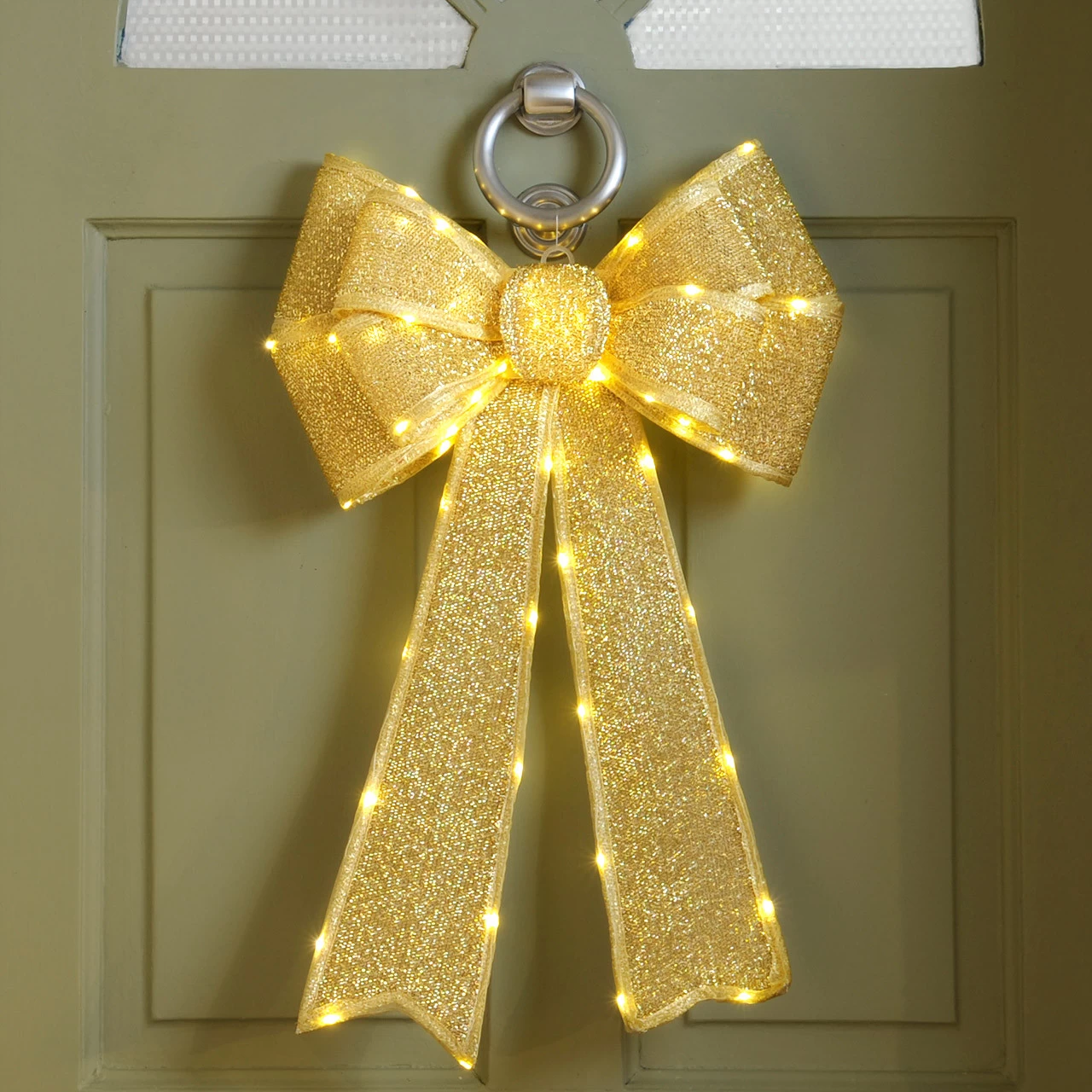 Festive Gold Battery Operated Christmas Door Bow with 84 Warm White LEDs