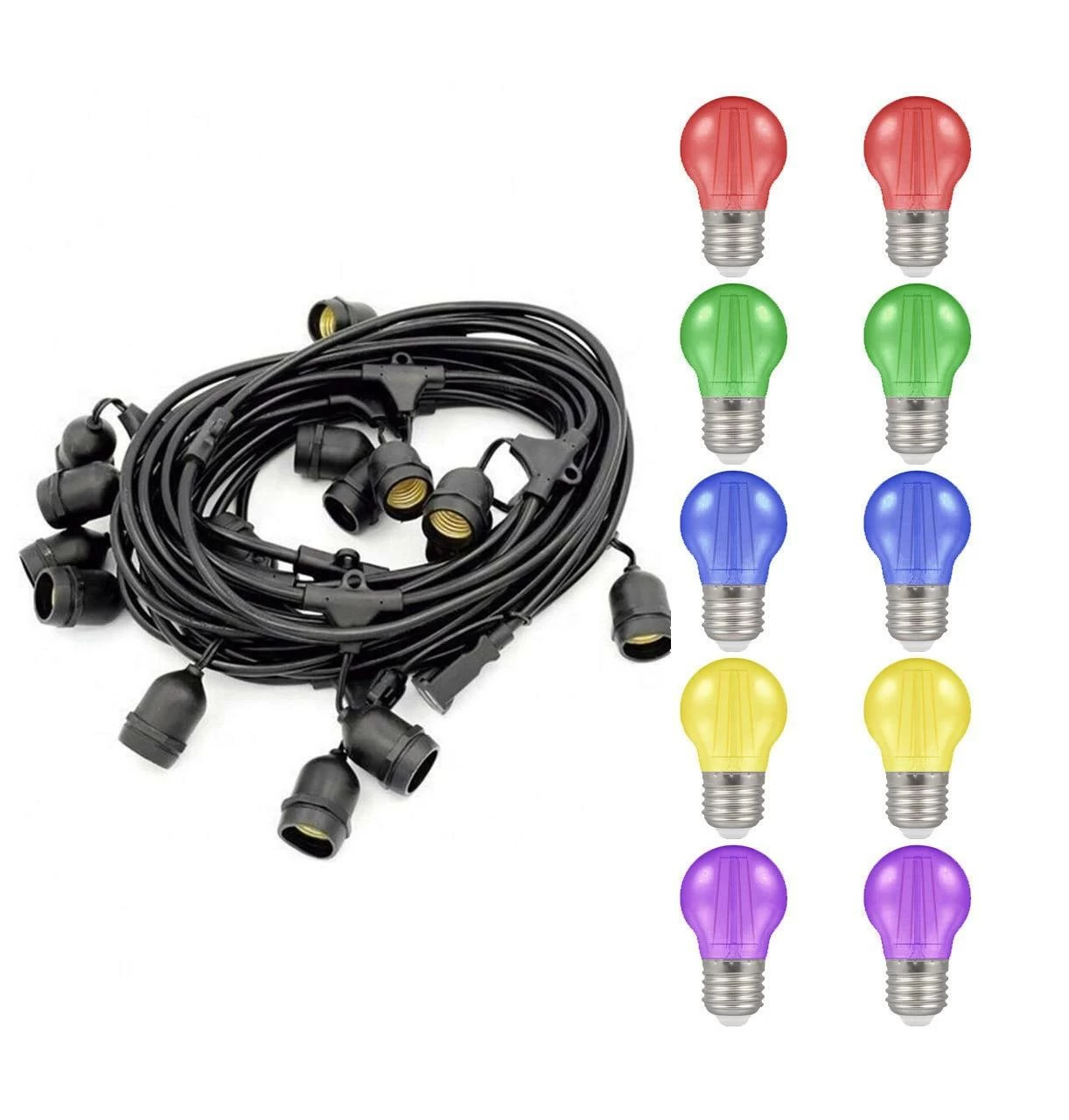 Kit comes complete with 1.5 mains cable and 3-pin UK plug, 5 metre festoon lights with 10x Edison Screw caps and mounting hooks, and 10x LED coloured golfball light bulbs.