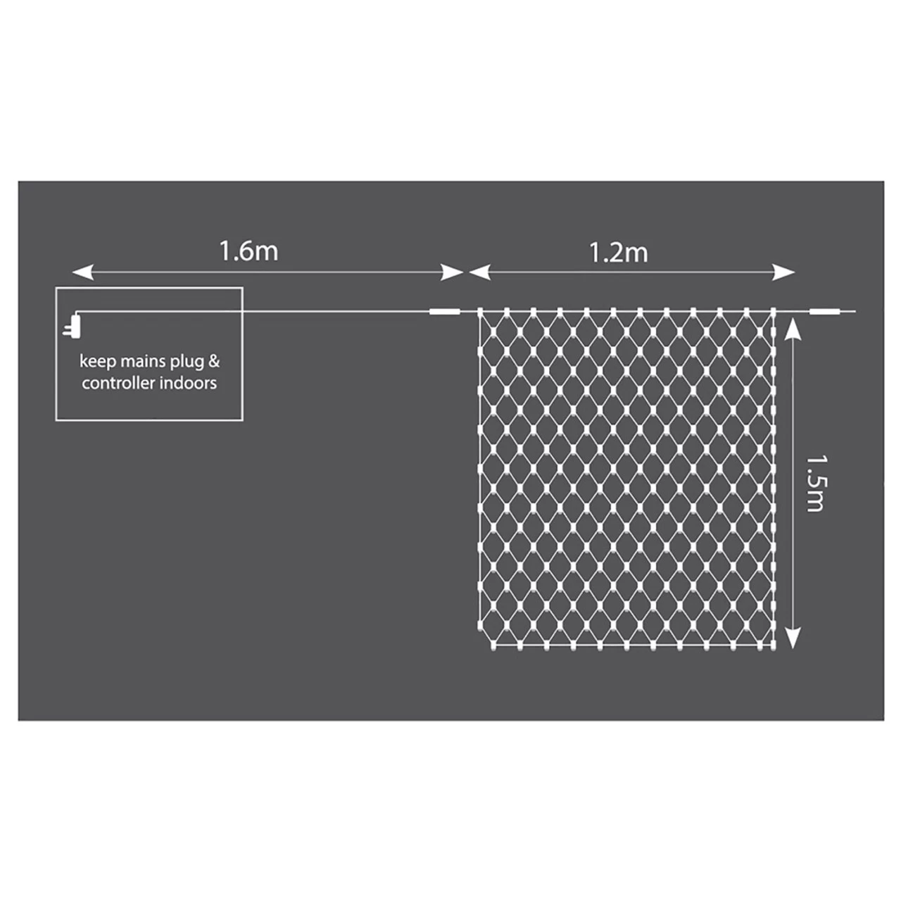 The total length of the fairy lights is 2.8metres. The net lights measure 1.5 metres in height and 1.2 metres in length with an additional 1.6 metres between the mains plug and the connector.