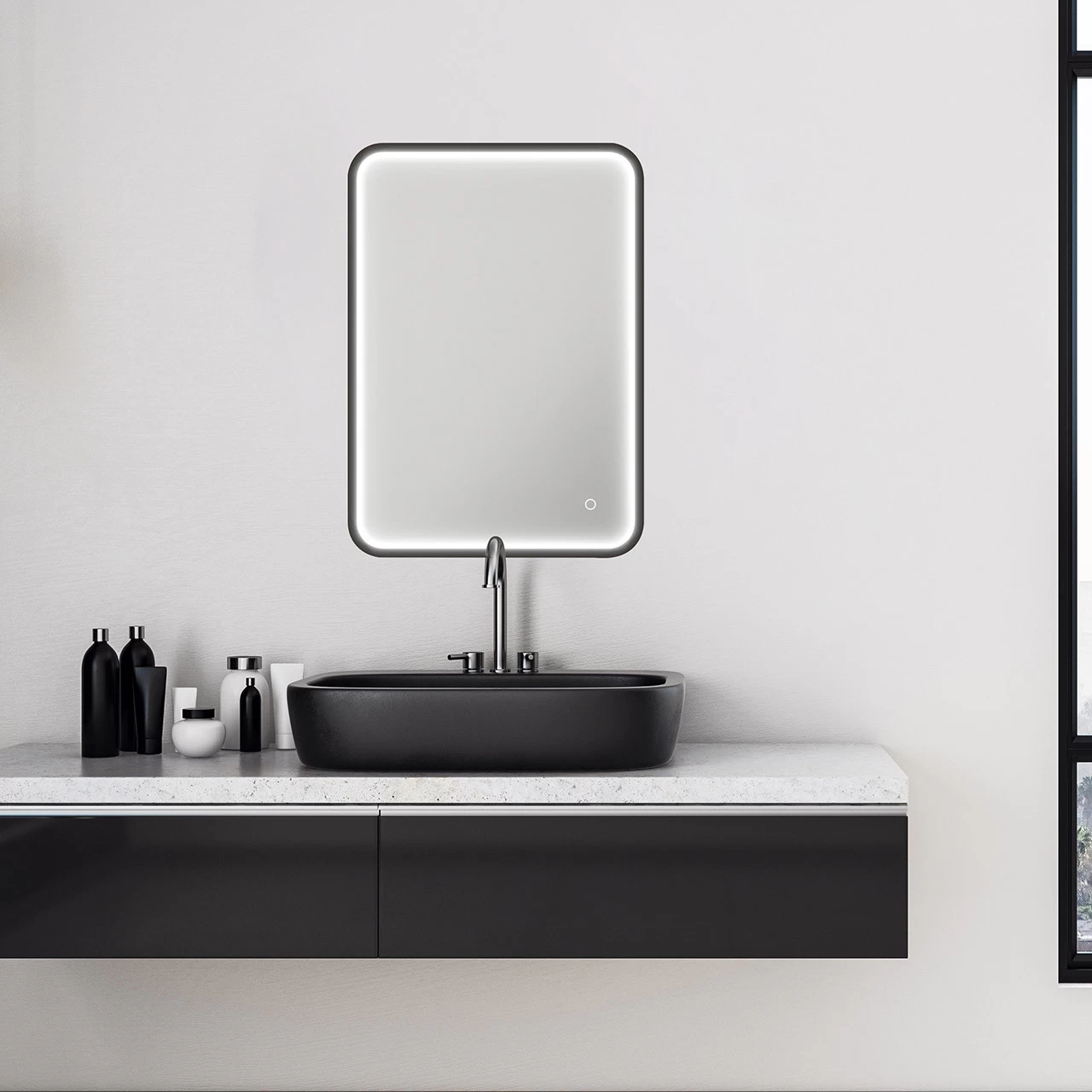 The NxtGen Missouri is a sleek and stylish black rectangular bathroom mirror with curved edges features a built-in demister and an integrated 38W LED illuminated border with a 4000K cool white colour especially suited for styling and personal grooming.