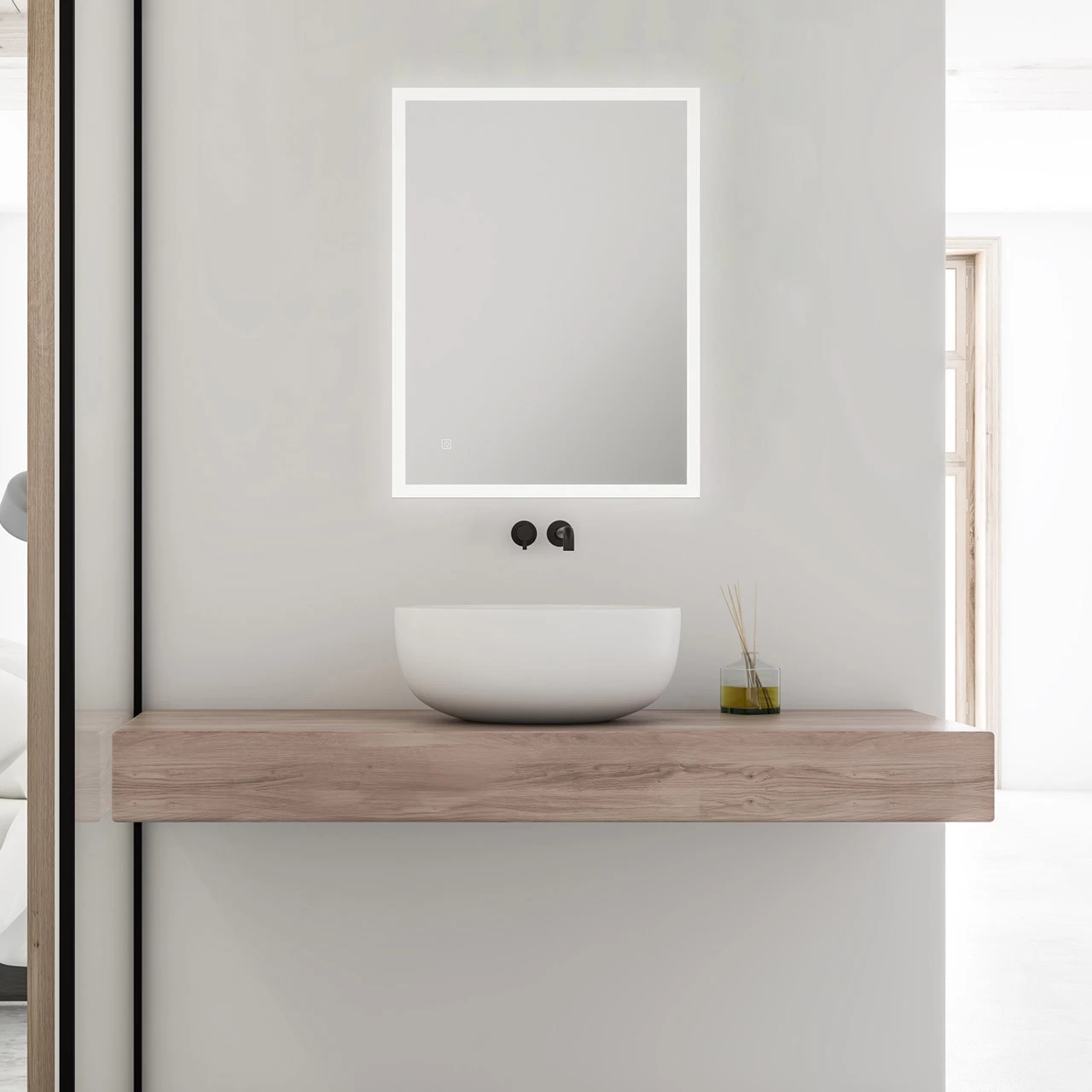 This illuminated mirror is 600mm wide x 800mm high and can be hung either portrait or landscape thanks to its mounting bracket. At only 24mm deep, this bathroom mirror features a slim profile that adds a touch of elegance to your bathroom.