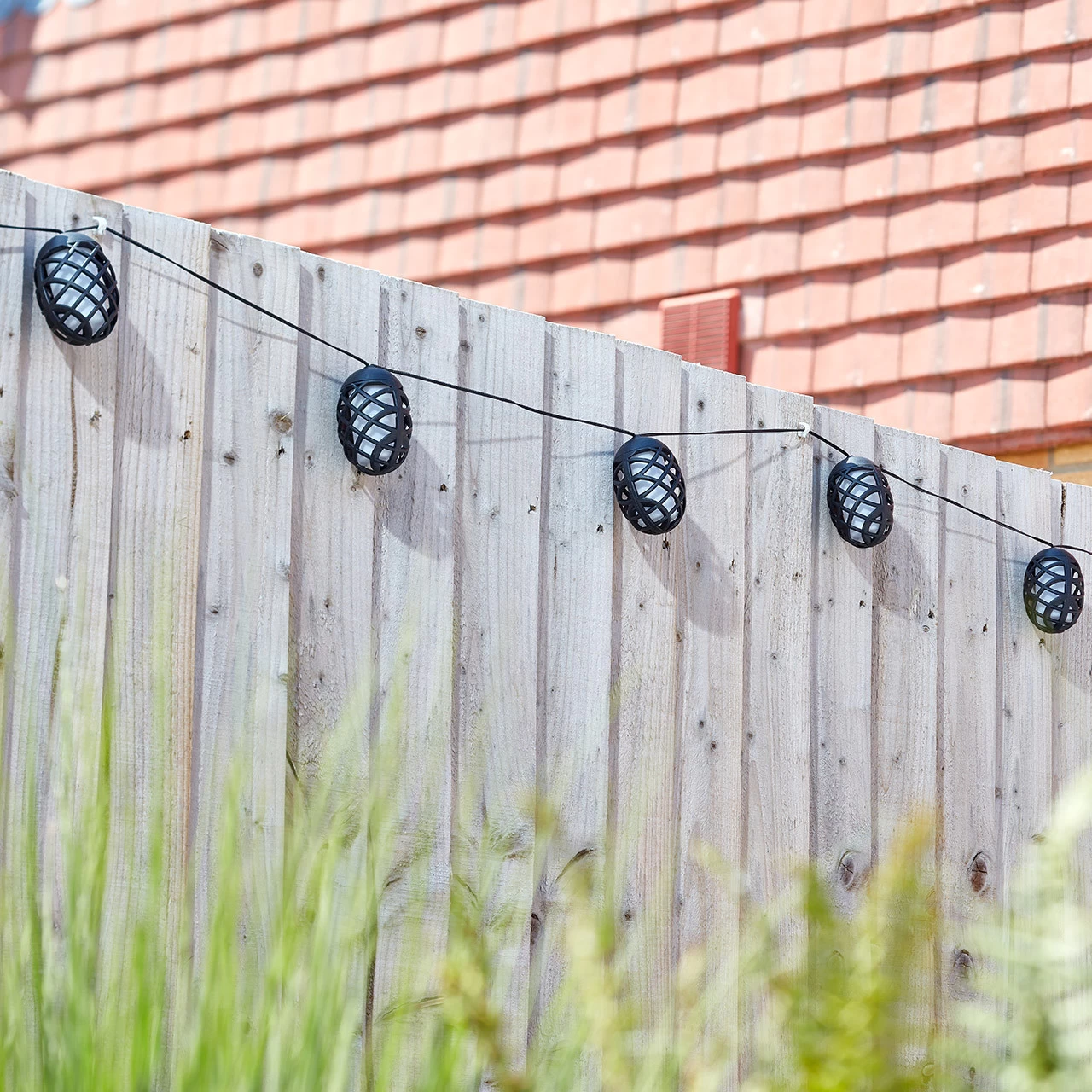 This solar string light features 10 individual flame lanterns (measuring 80mm x 60mm) spaced 30cm apart, giving a total lit length of 2.7m. A 2m wire from the lights to the solar panel mean it is easy to place the solar panel where it will receive maximum exposure to sunlight using the supplied ground spike.