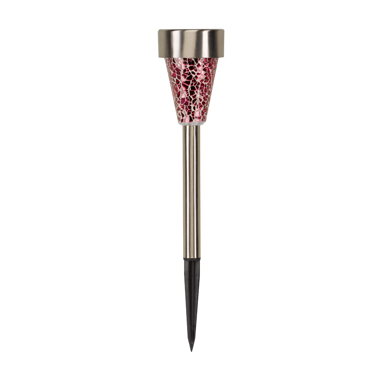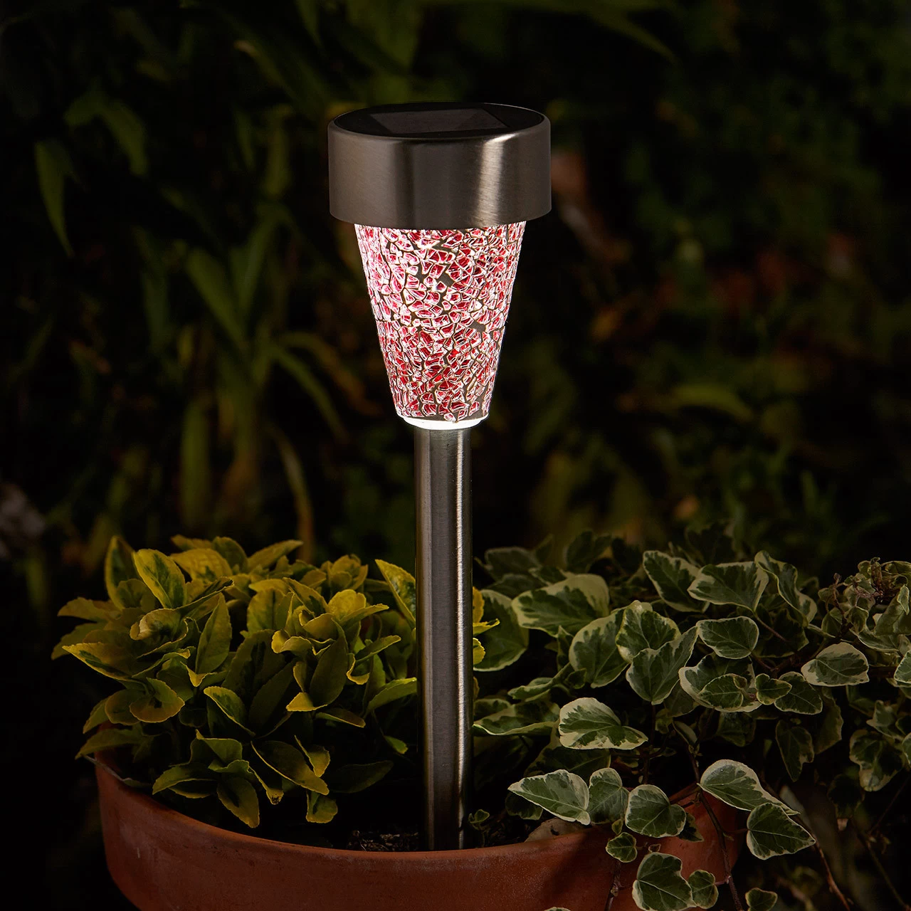 This pack of 6 Mosaic LED solar stake lights feature a brushed stainless steel finish and coloured mosaic effect making them ideal for illuminating your garden, flower beds, borders, pathways or driveways.