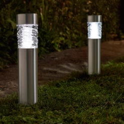 This pack of Stella LED solar bollard lights from Smart Solar feature a brushed stainless steel finish and a unique rippled glass design.