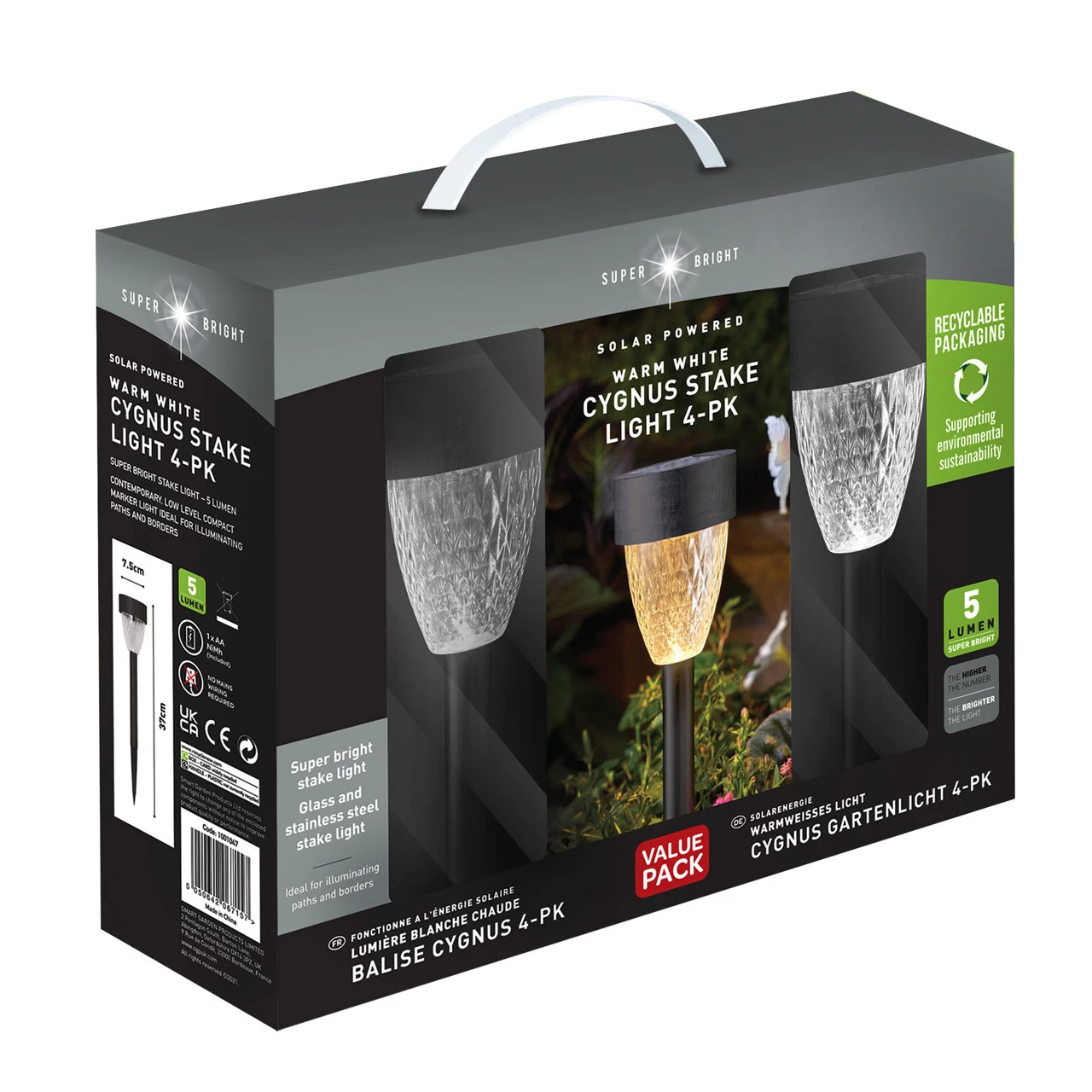 Brighten up your pathways, driveways, flower beds or garden borders with this pack of 4 premium quality SuperBright Cygnus solar stake lights from Smart Solar. Each solar garden stake light outputs 5 lumens of light, which is a significantly brighter light than regular solar powered lights.