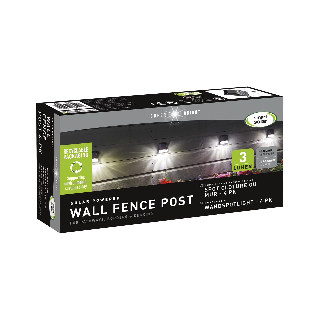 This pack of 4 LED solar fence lights from Smart Solar are a cost effective solution for hassle-free illumination of your paths, steps as well as a garage or shed exteriors. Each LED solar garden fence light outputs 3 lumens of bright light, which is a significantly brighter light than regular solar powered lights.