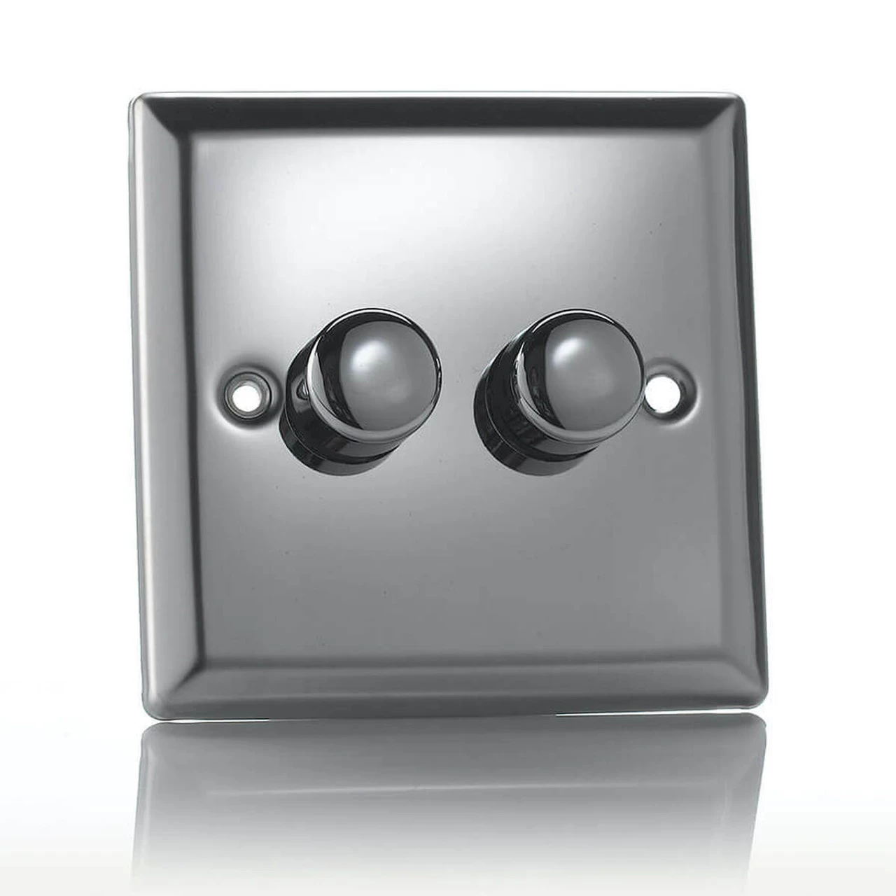 Twin gang, 2 way, push-on/off rotary LED dimmer switch in mirror chrome finish. This state of the art dimmer switch from Varilight incorporates V-Pro intelligent dimming technology, soft start feature and intelligent overload protection, adjustable minimum brightness setting and choice of driving modes. With a maximum LED load rating of 120W and capacity for up to 10 lamps.