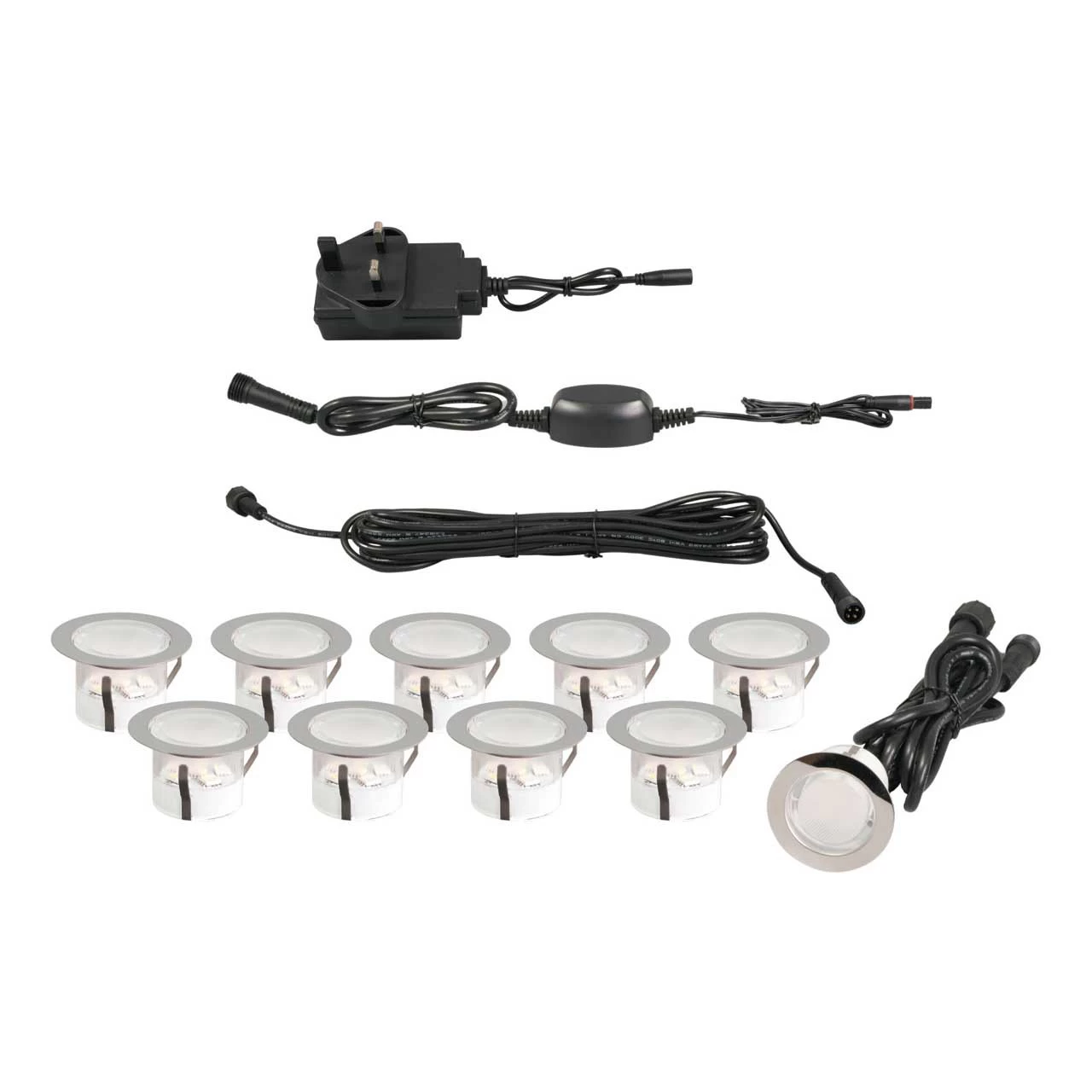 The kit contains 1 x 12V IP20 inline plug-in transformer with a 5-metre extension lead and 10 x IP65 LED light fittings each with 1.2-metre of cable between each head.