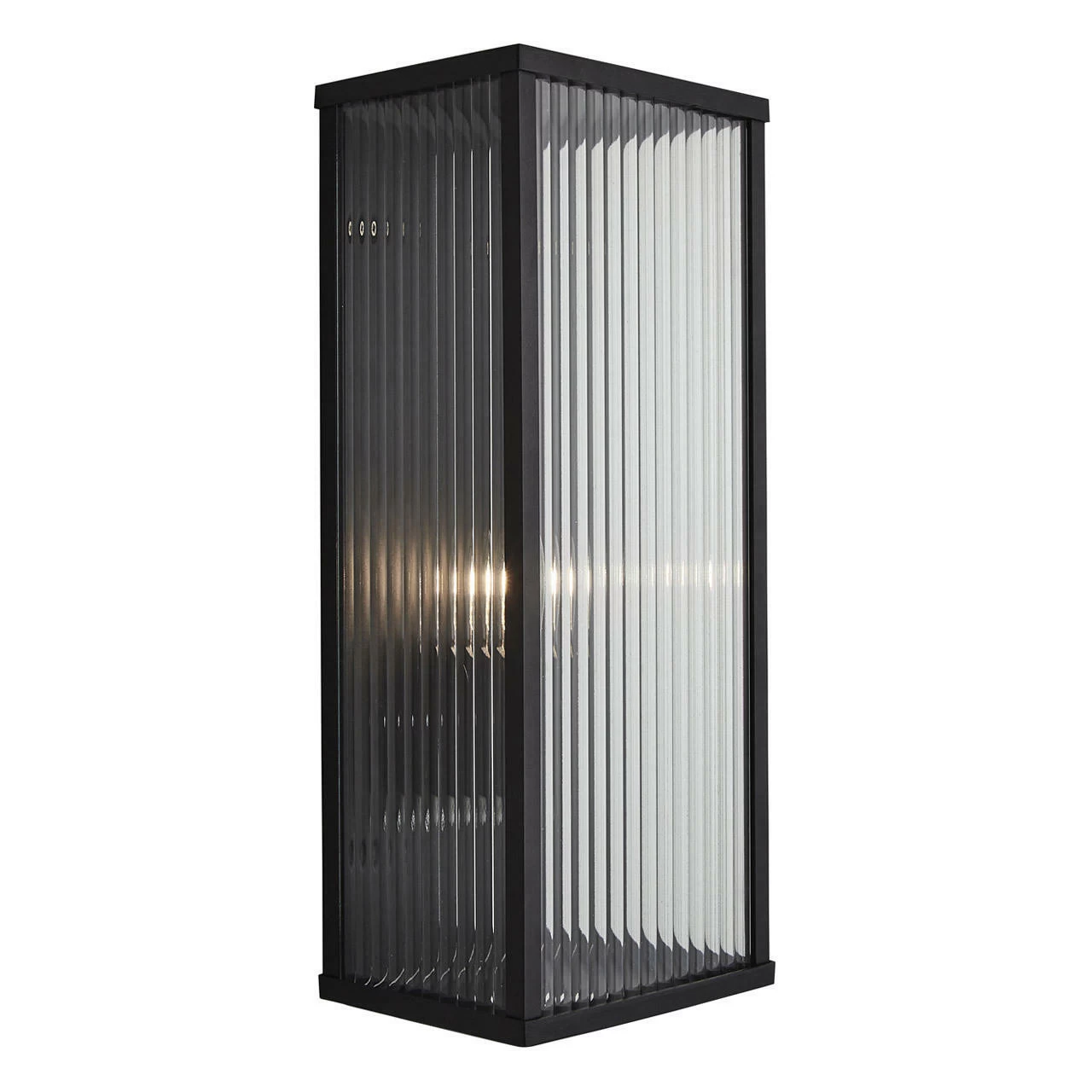 A contemporary glass panel box lantern with a stainless steel frame and ribbed effect glass panels, these outdoor wall lights are both weatherproof and hard-wearing, designed to last against the elements.